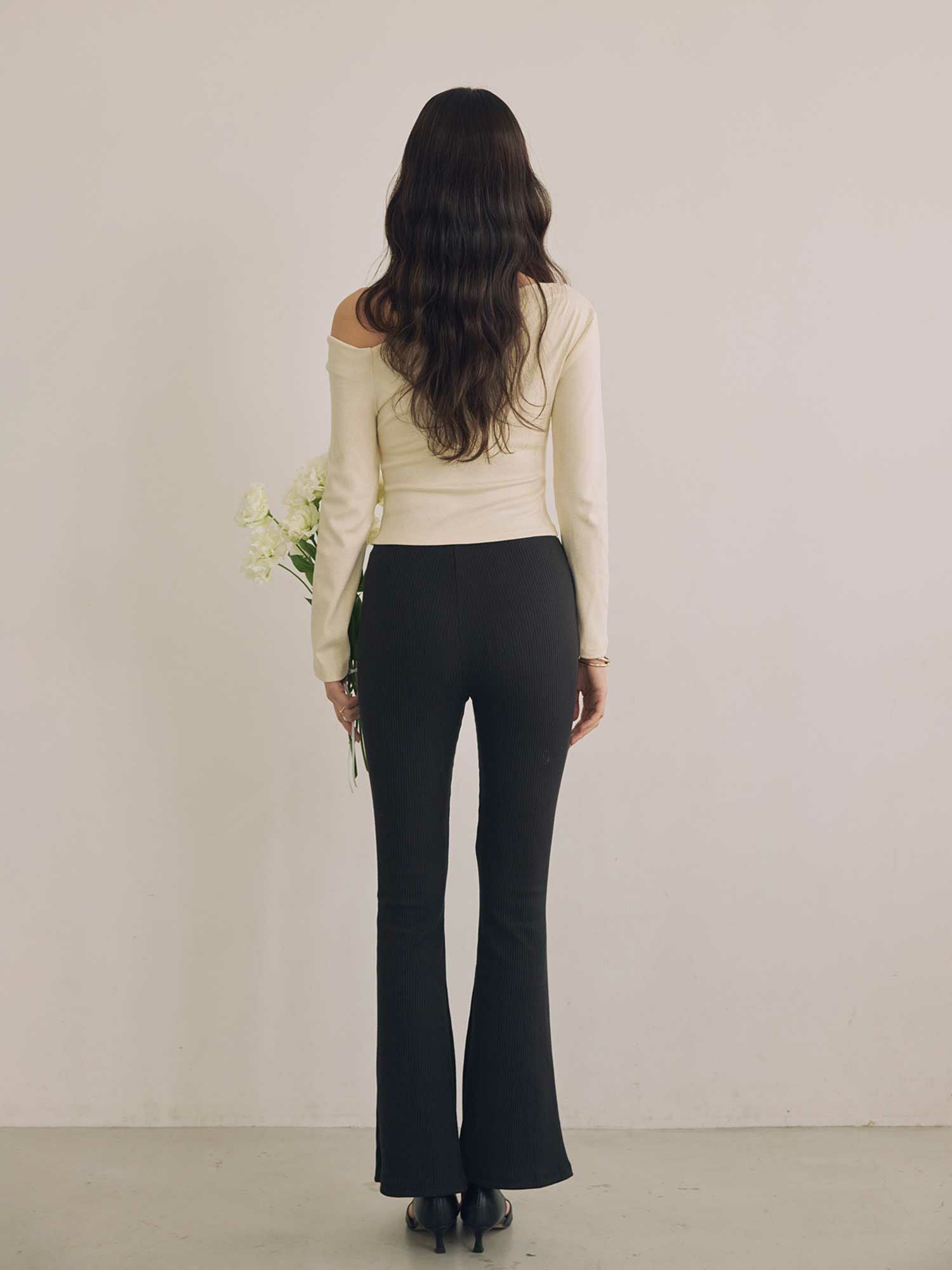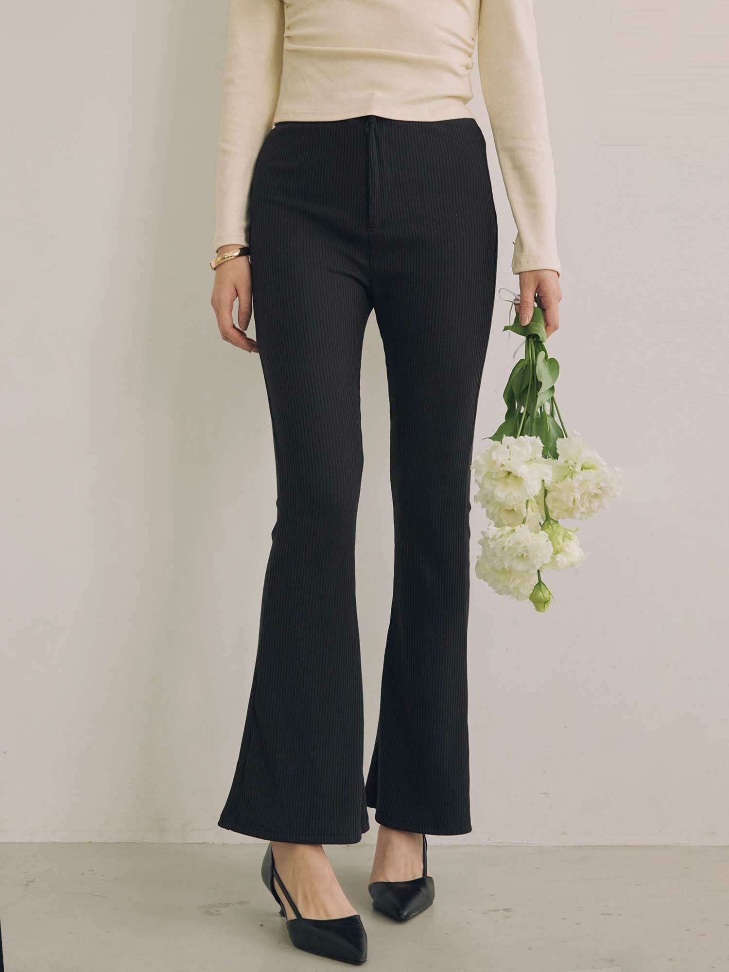 ウエストから膝まではすっきりとフィットし、裾に向かって緩やかに広がるシルエットが美脚を演出するフィットフレアパンツ。
