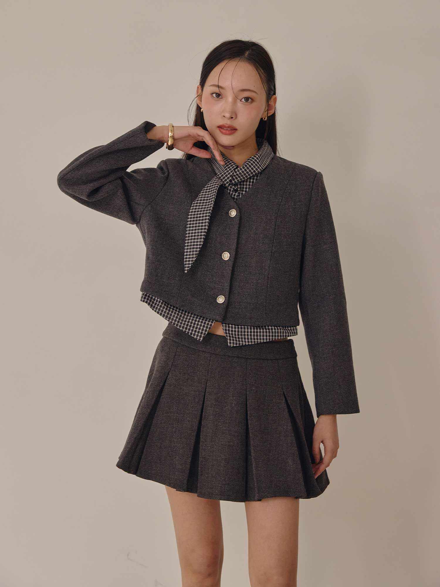 チェックシャツのレイヤード風デザインのノーカラージャケットとタックプリーツスカートのセットアップです。