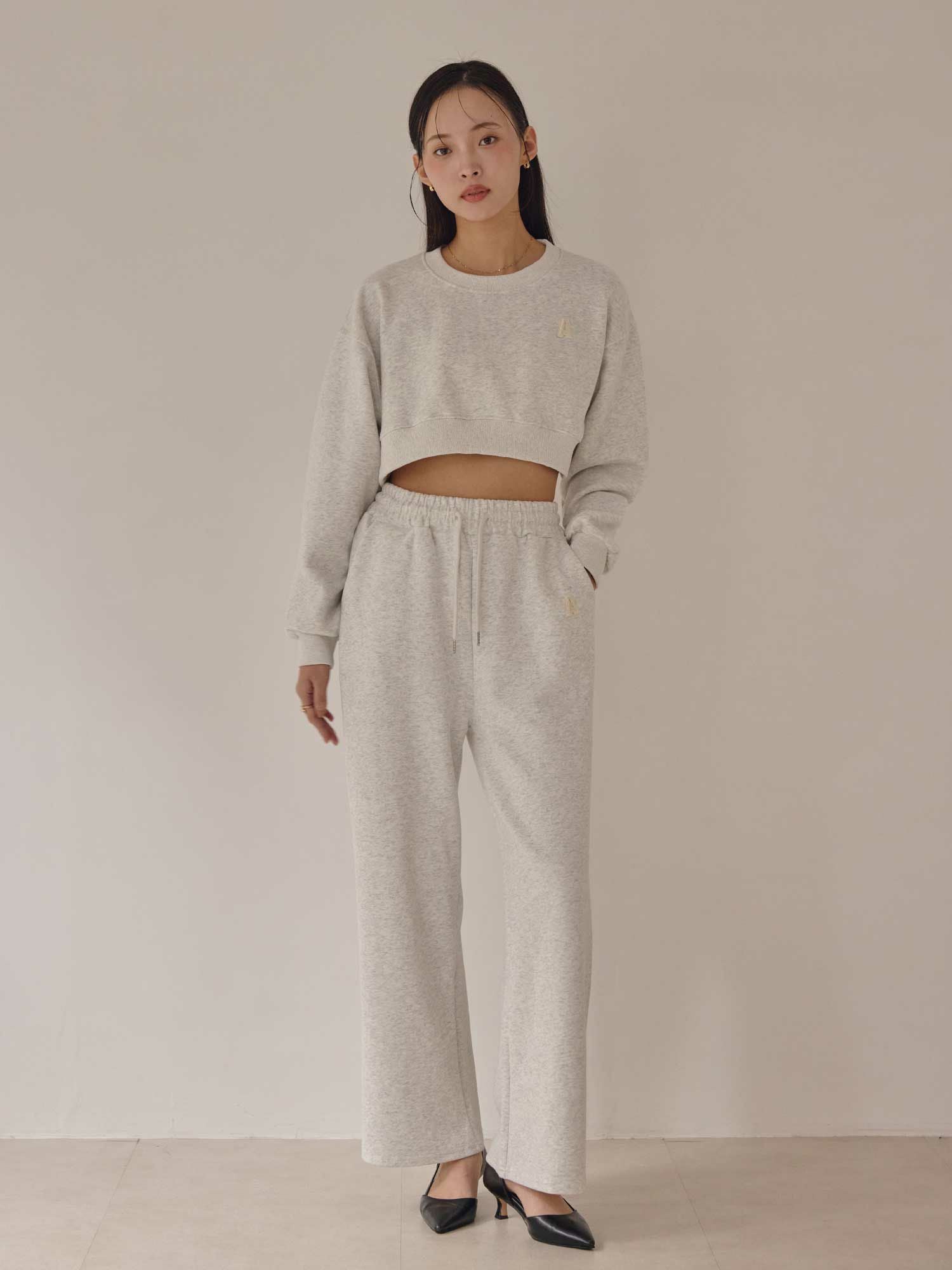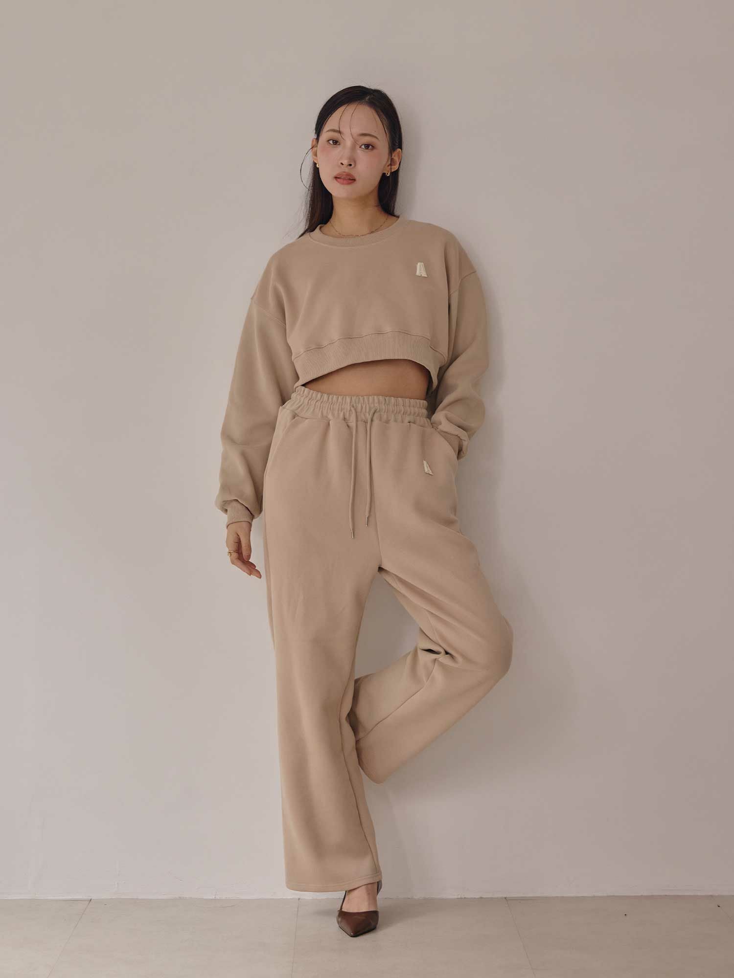 別売りで同生地のAロゴフレアスエットパンツとセットアップでの着用がおすすめです。