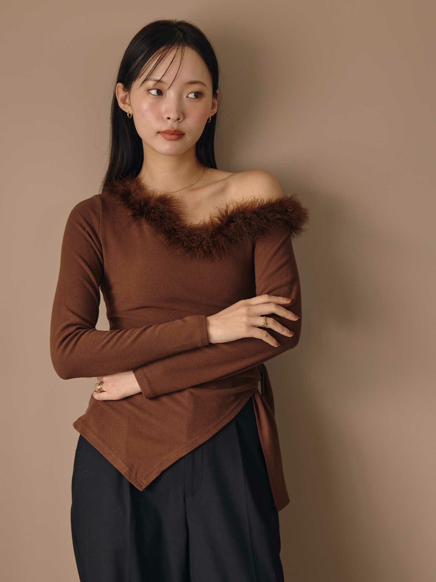 ワンショルダーのデコルテファーとウエストのサイドリボンデザインがポイントのトップスです。