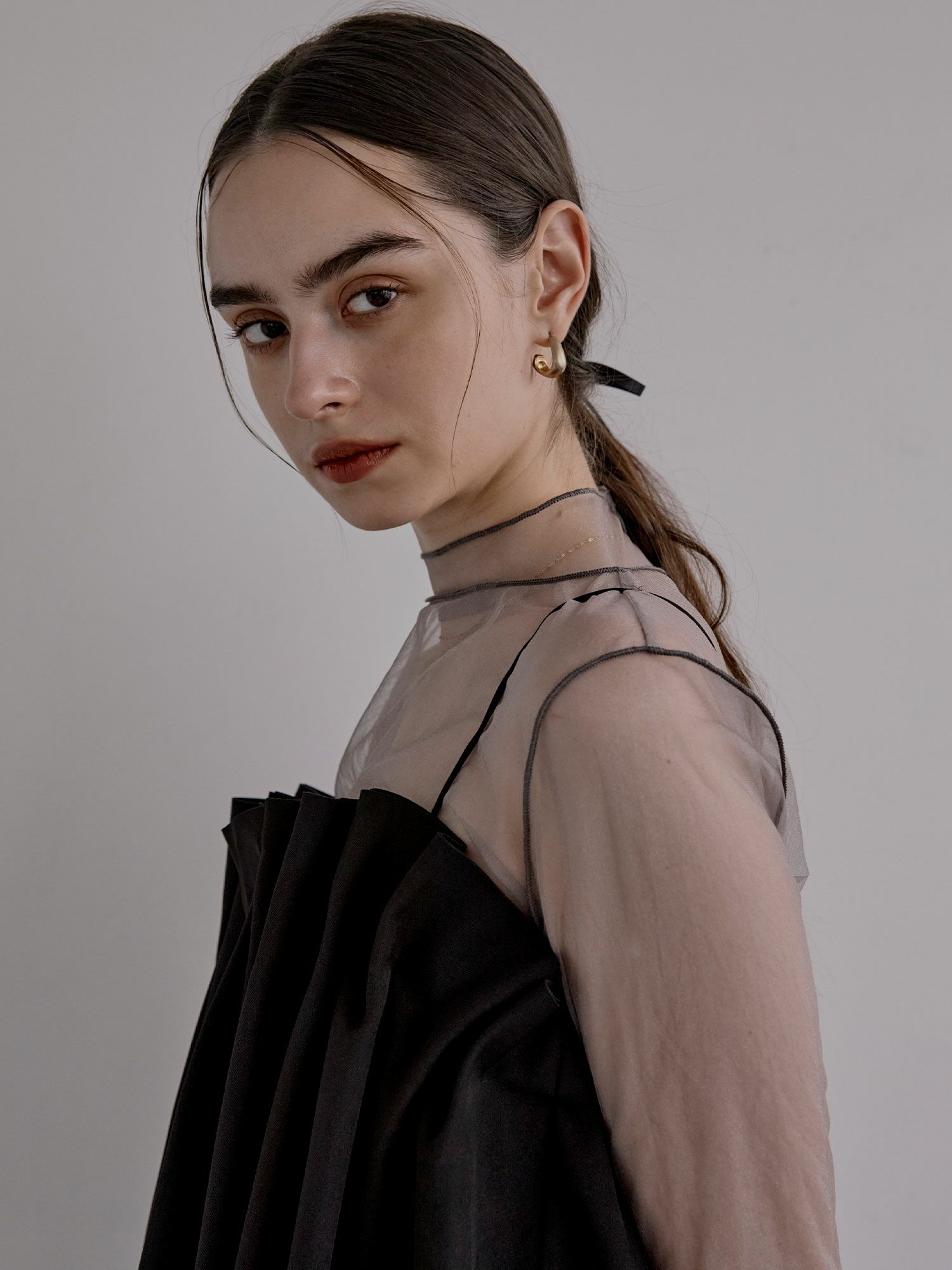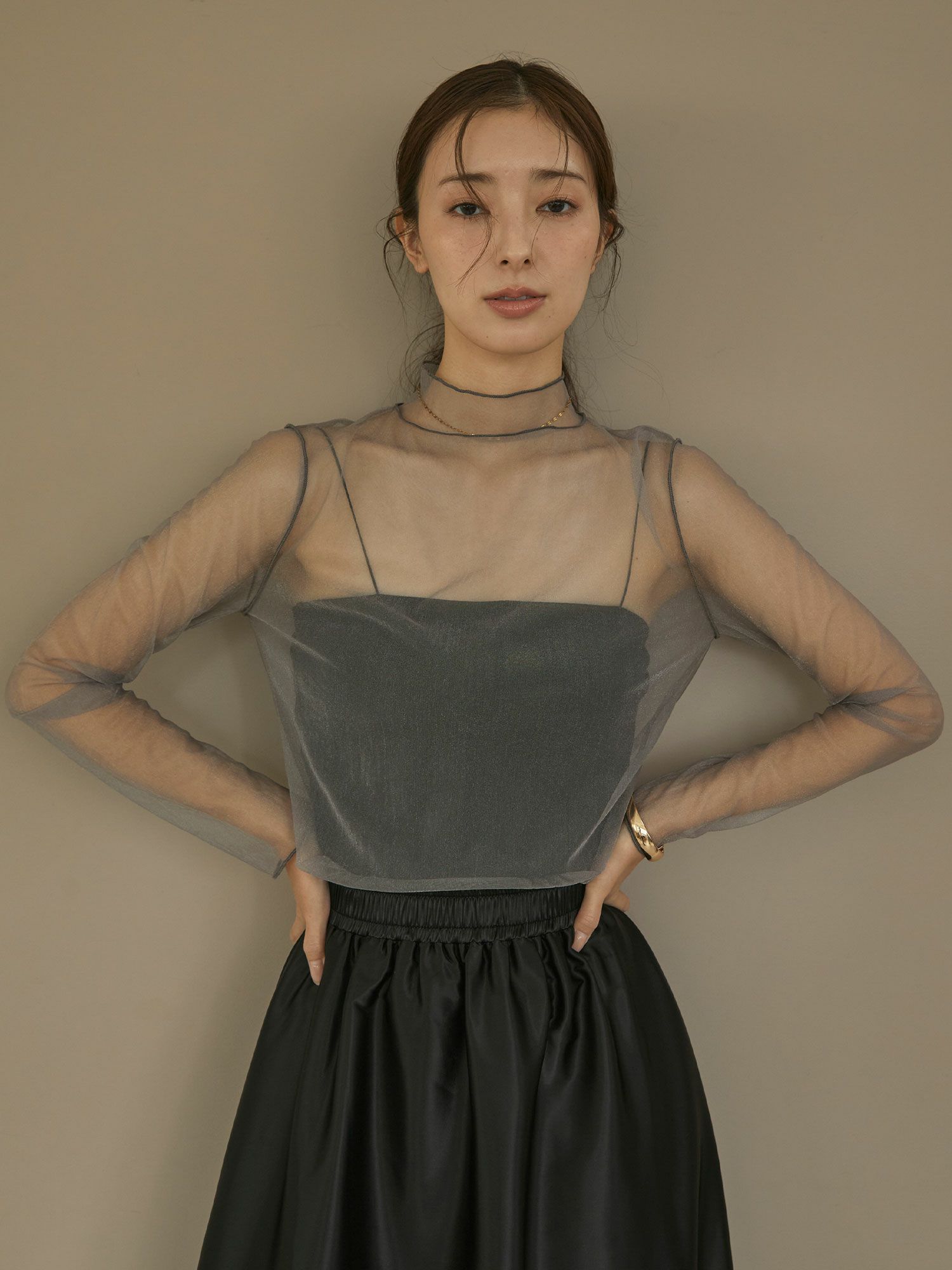 シアー感のあるチュール素材を使用したハイネックトップスです。