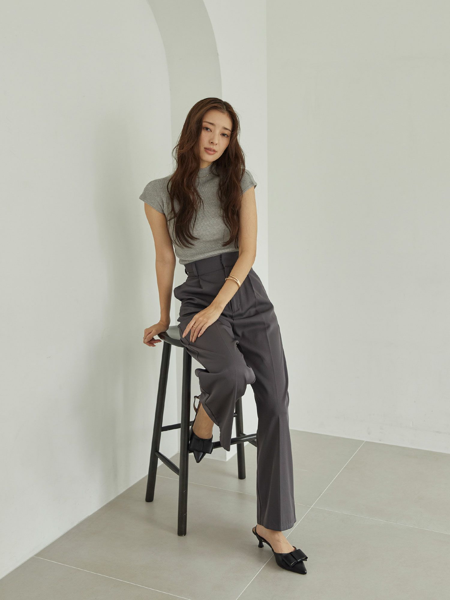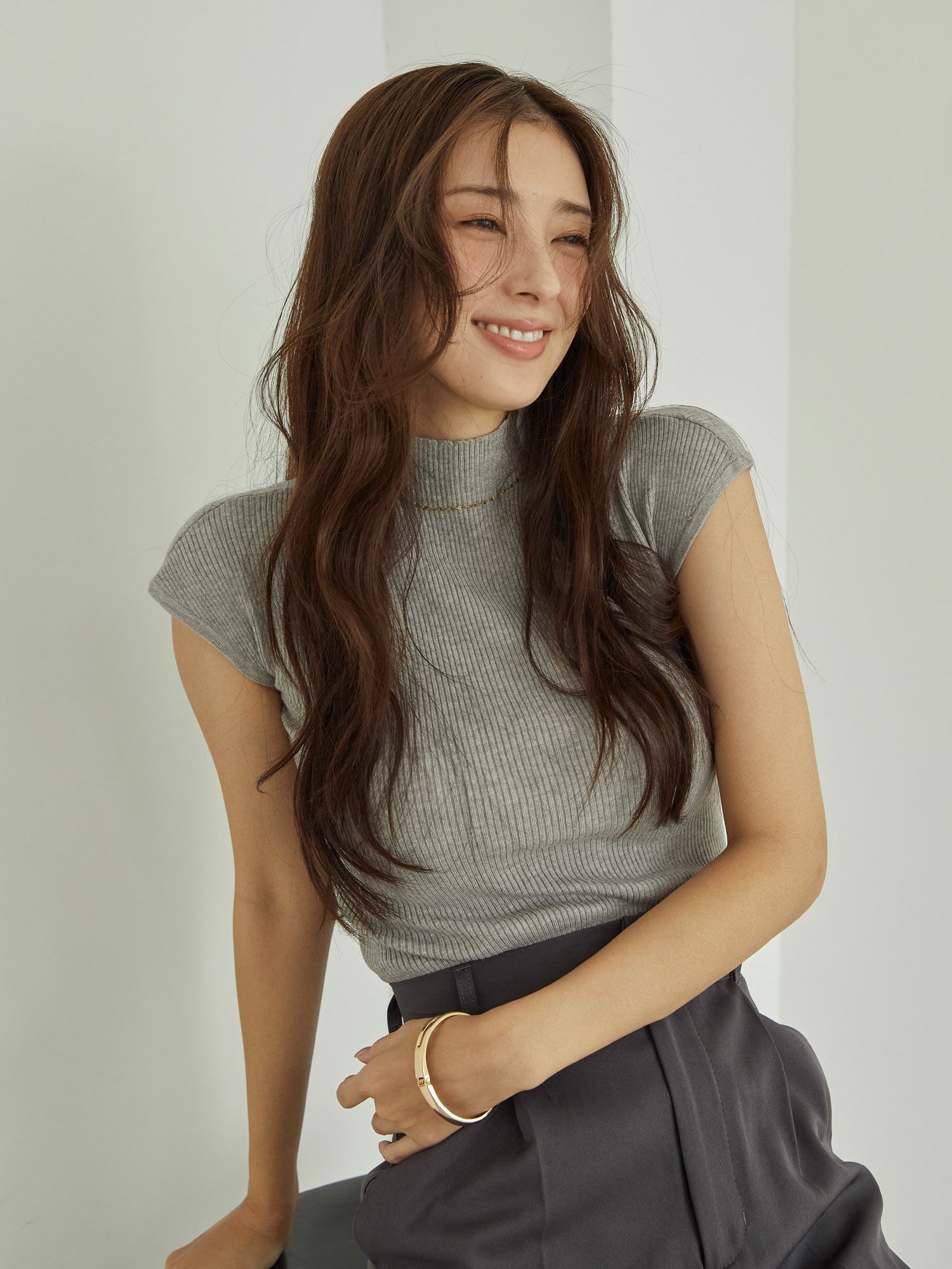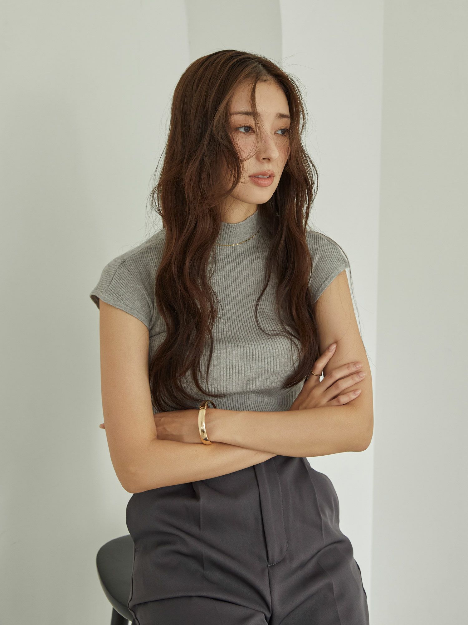 細かいリブ編みの生地が上半身の細身え効果も抜群です。