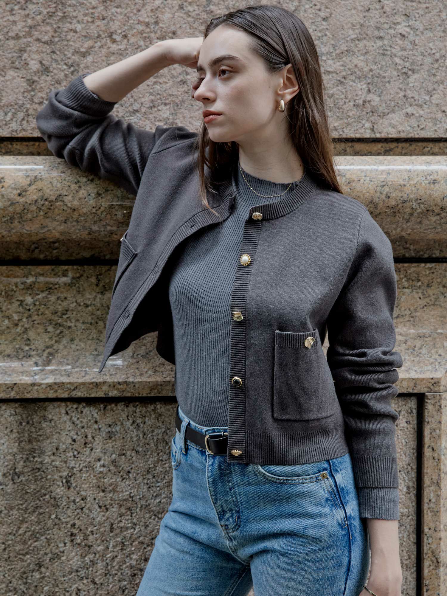 シンプルなデザインながら、ビジューボタンが目を惹く一枚。